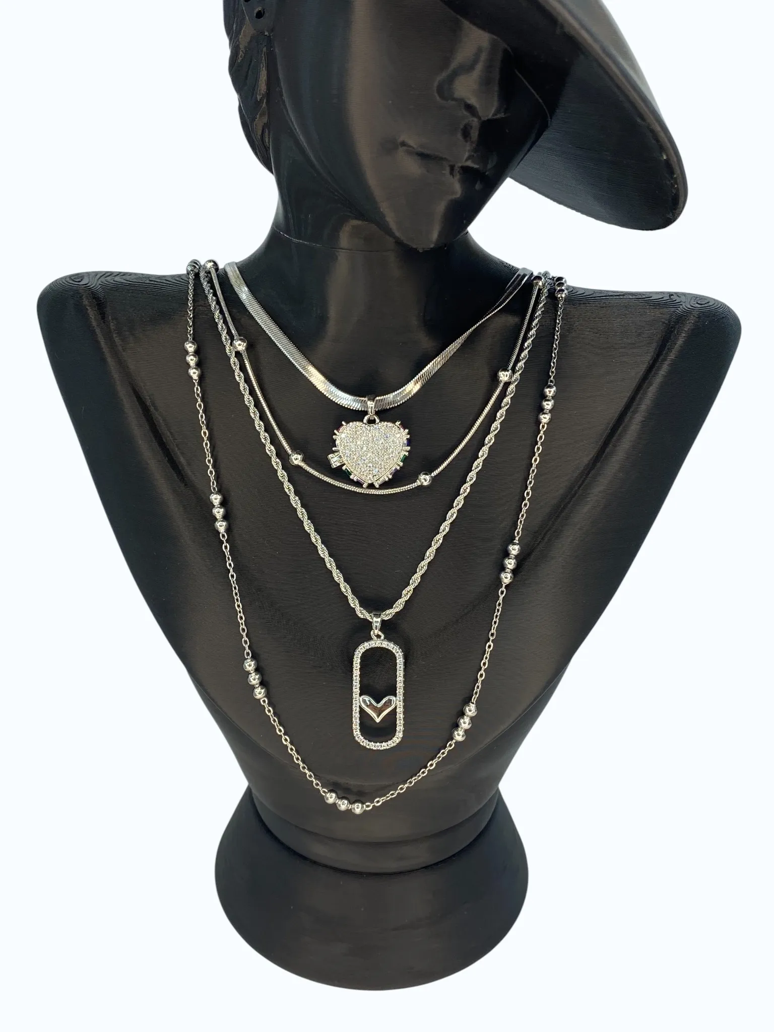 Silver Çelik Açılan Kalp Uçlu Taşlı Çoklu Kolye