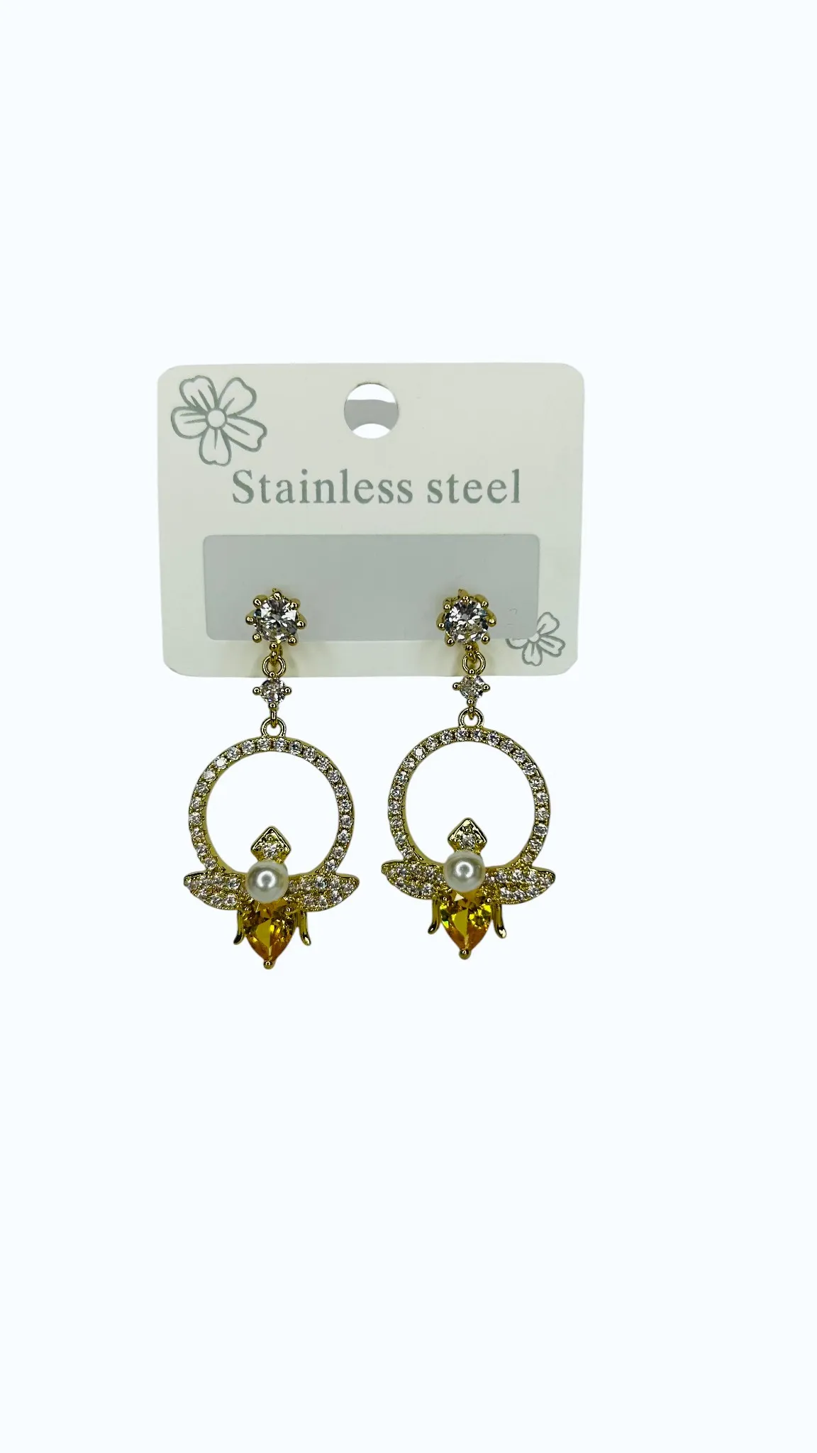Gold Çelik Arılı Sarı Taşlı Sallantılı Küpe adet
